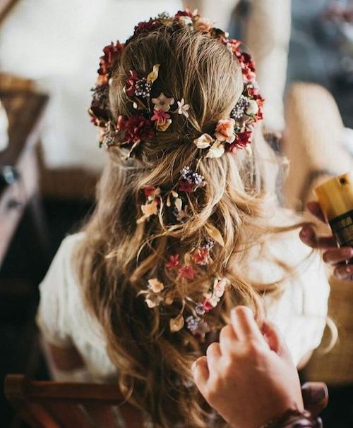 La couronne de fleurs pour un mariage champêtre peut être colorée ou blanche. On opte pour des roses, orchidées, freesias, gypsophiles, lisanthius, marguerites, lilas, hortensias et fleurs des champs qui tiennent très bien dans les cheveux, ne cassent pas et restent fraîches assez longtemps. On peut également ajouter du feuillage comme le lierre, l’eucalyptus ou les feuilles de framboisier par exemple. Pour le coiffage, on évite la laque et autres produits capillaires qui peuvent abîmer les fleurs naturelles.